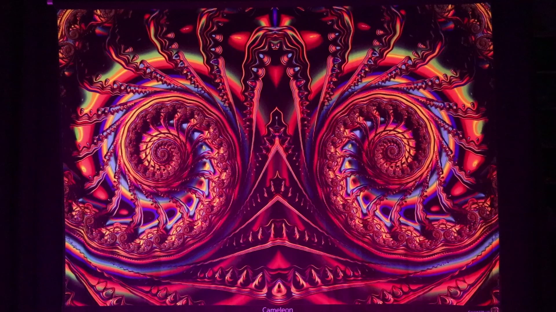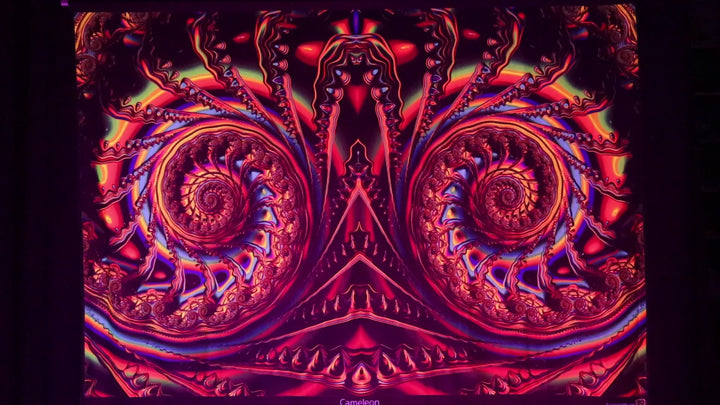 Printed tapestries with UV fluorescent pigment ink so they glow under UV light and become colors animated under RGB LED light.