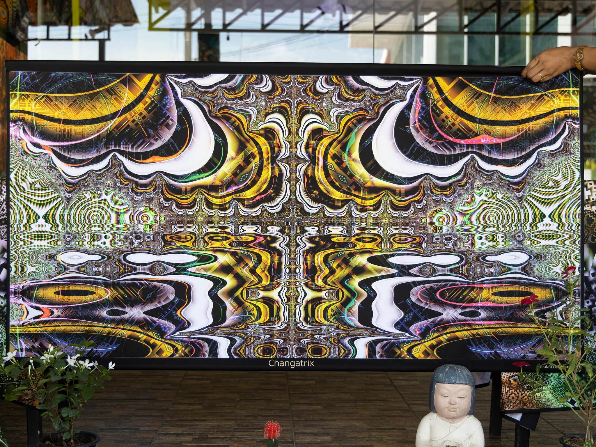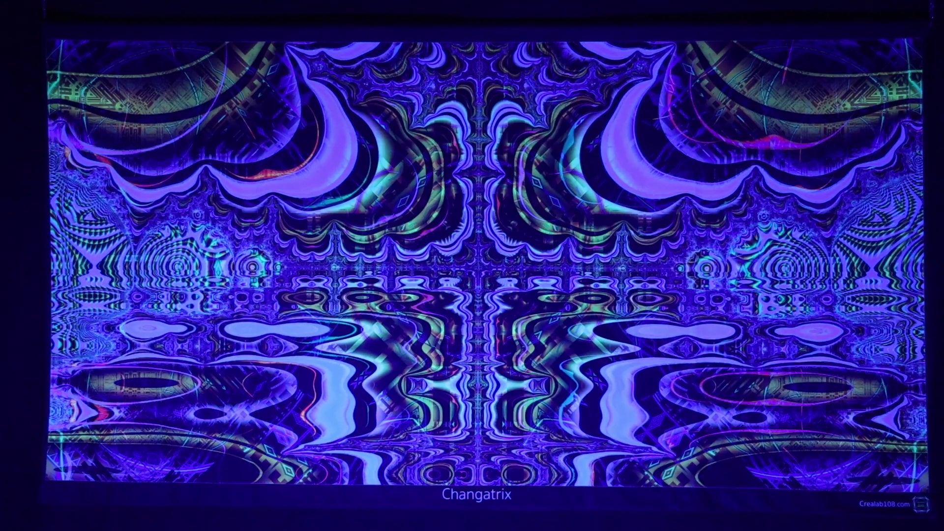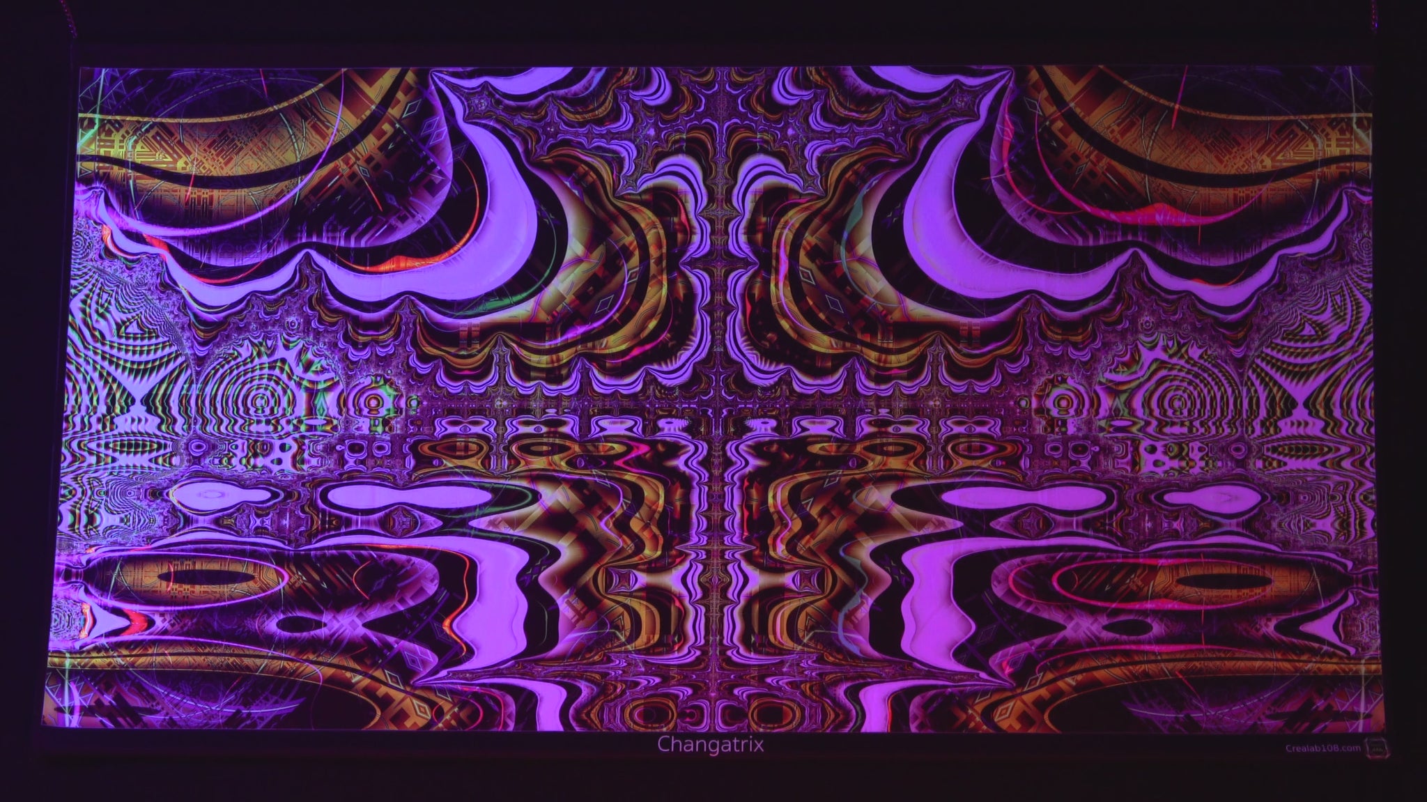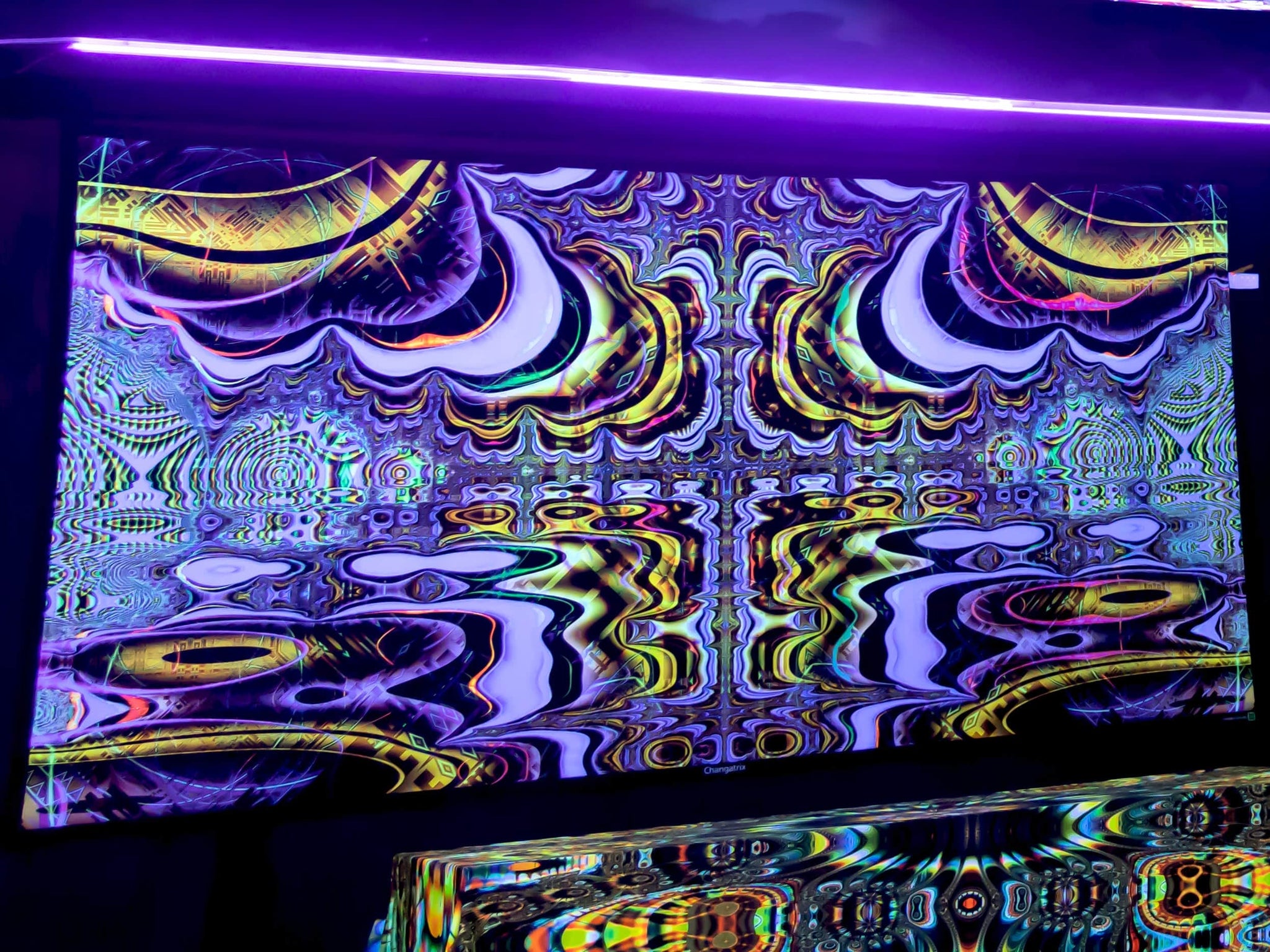Printed tapestries with UV fluorescent pigment ink so they glow under UV light and become colors animated under RGB LED light.