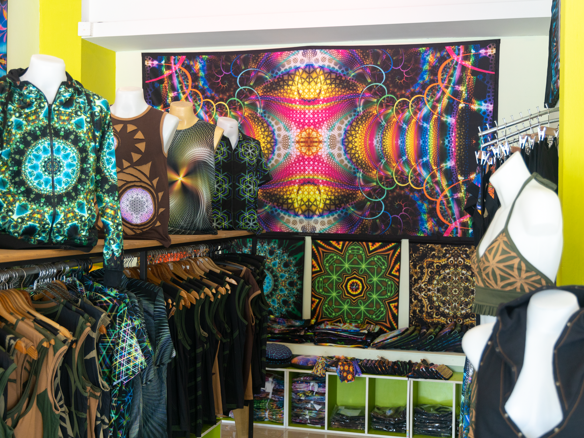 Printed tapestries with UV fluorescent pigment ink so they glow under UV light and become colors animated under RGB LED light.