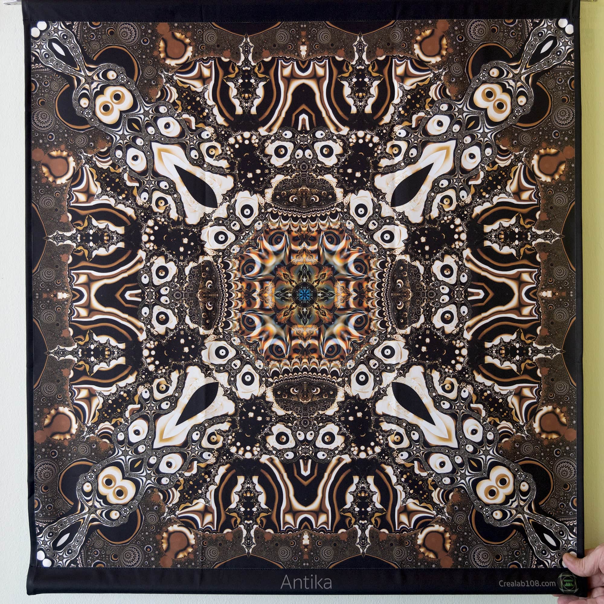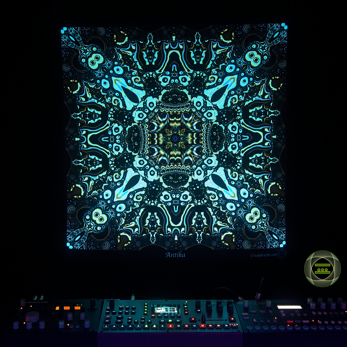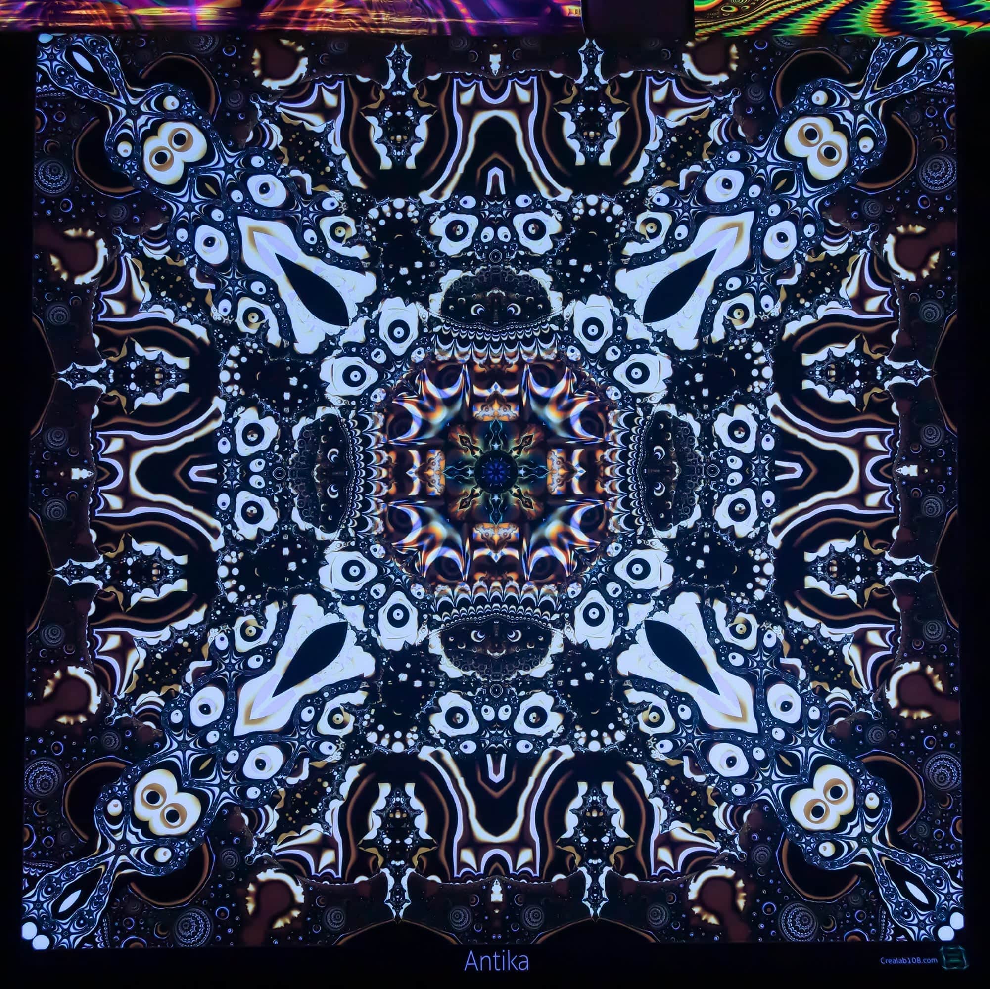 Printed tapestries with UV fluorescent ink to become color-animated under RGB Led light and fully glowing under UV light.