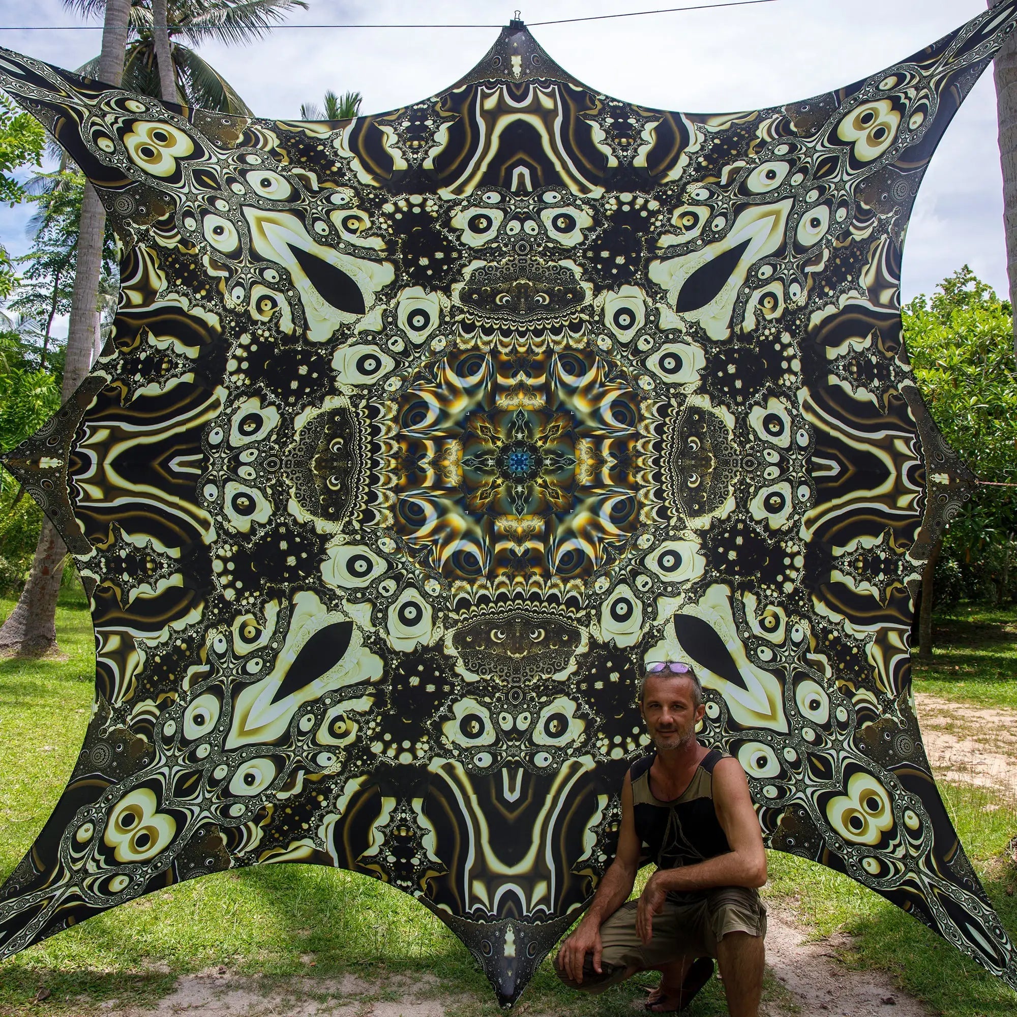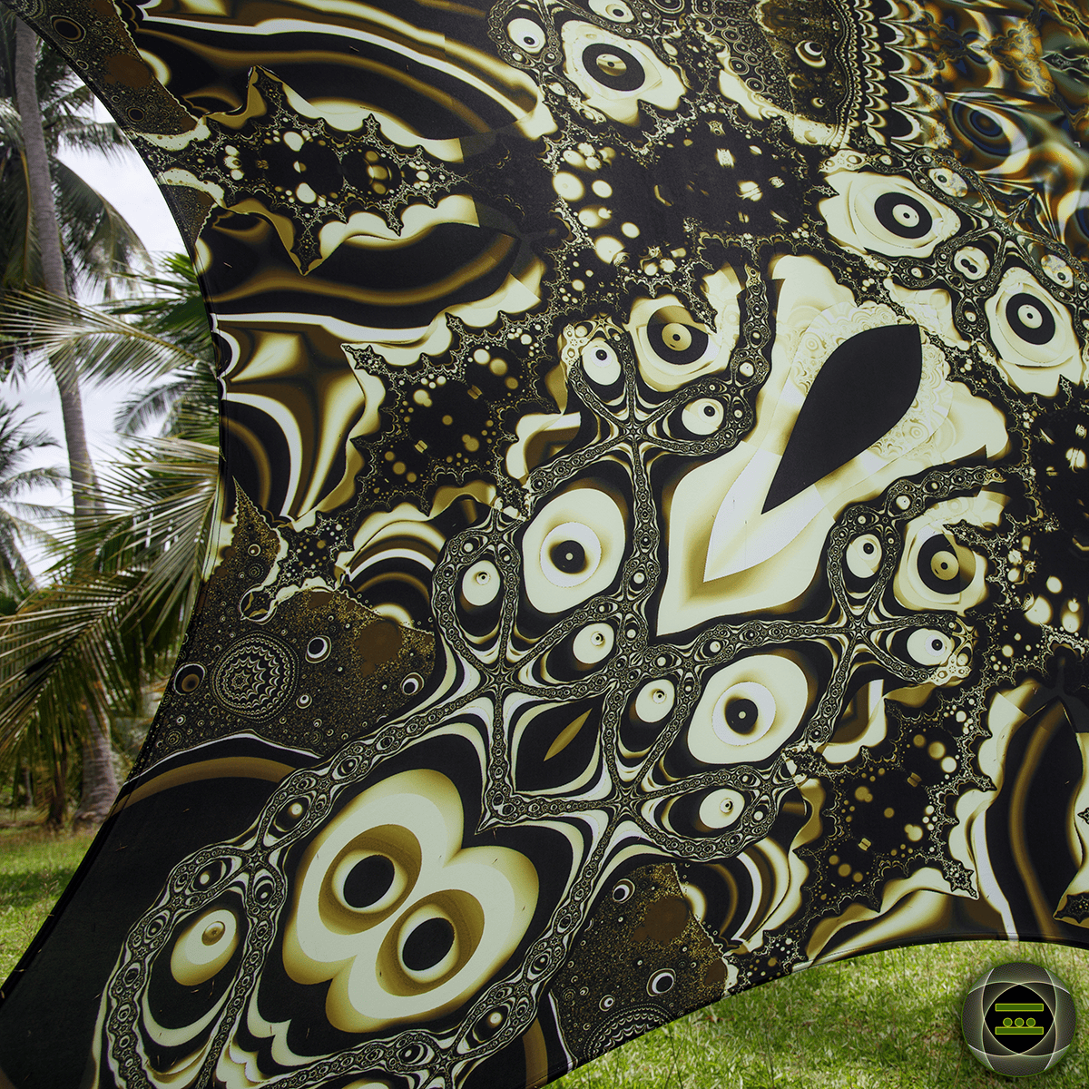 Only the GIANT size 310/310cm - 122/122 inches (at rest) is printed with a curved shape with 8 eyelets all around that are mounted on a reinforced band.
