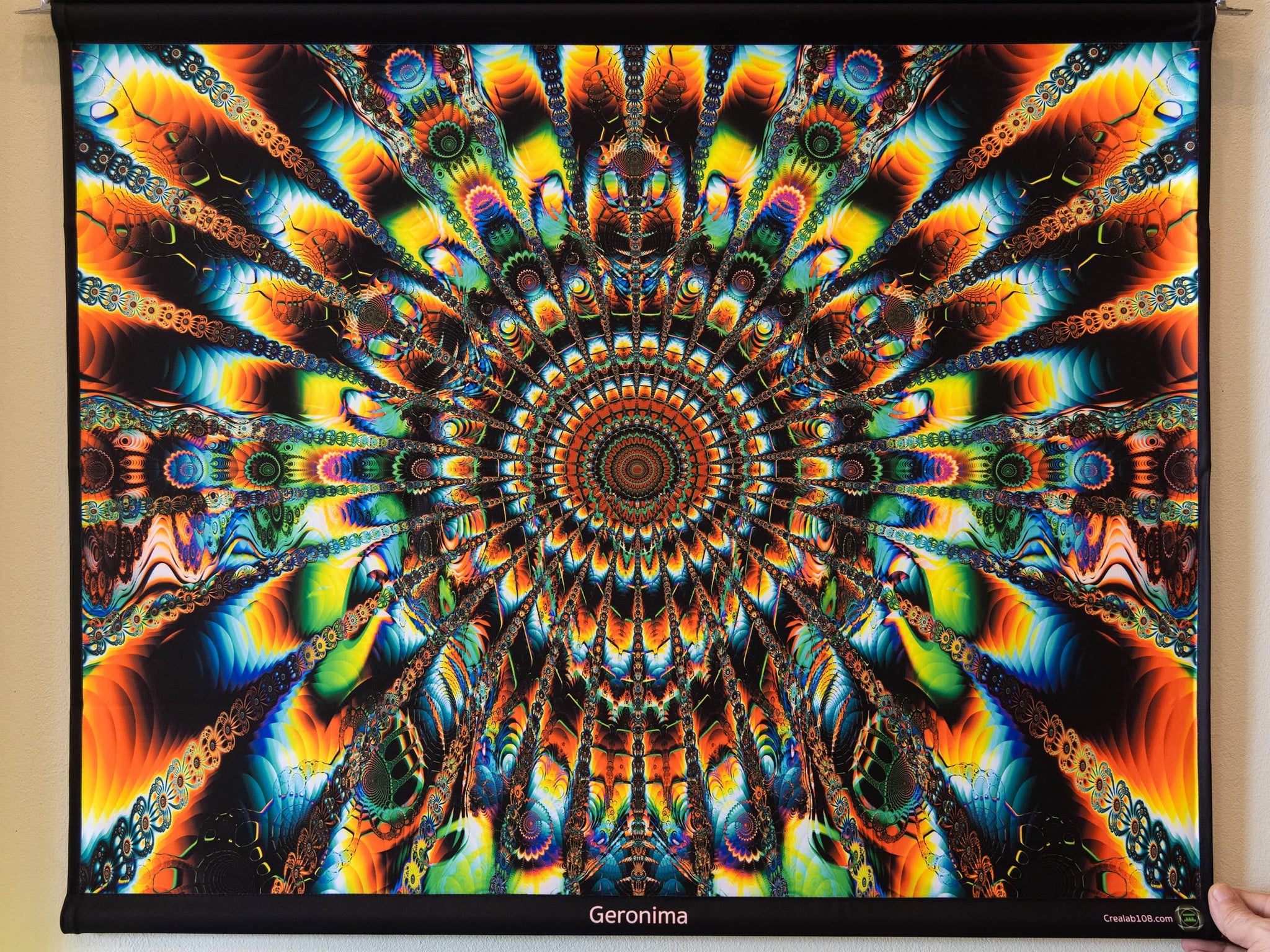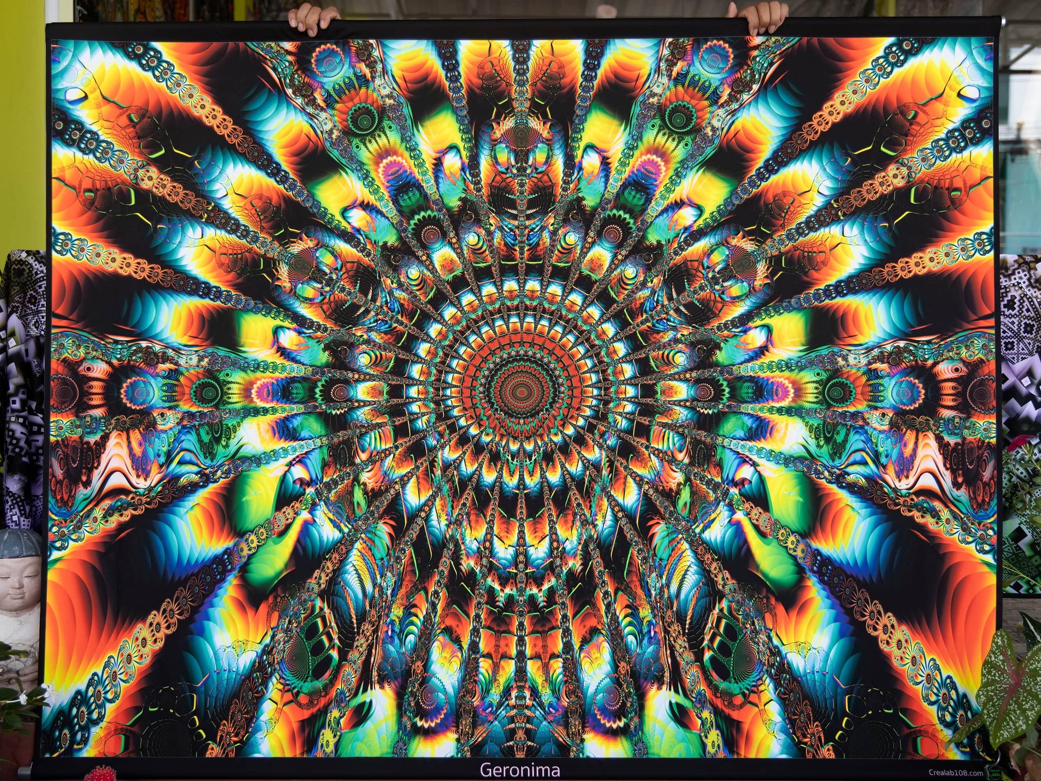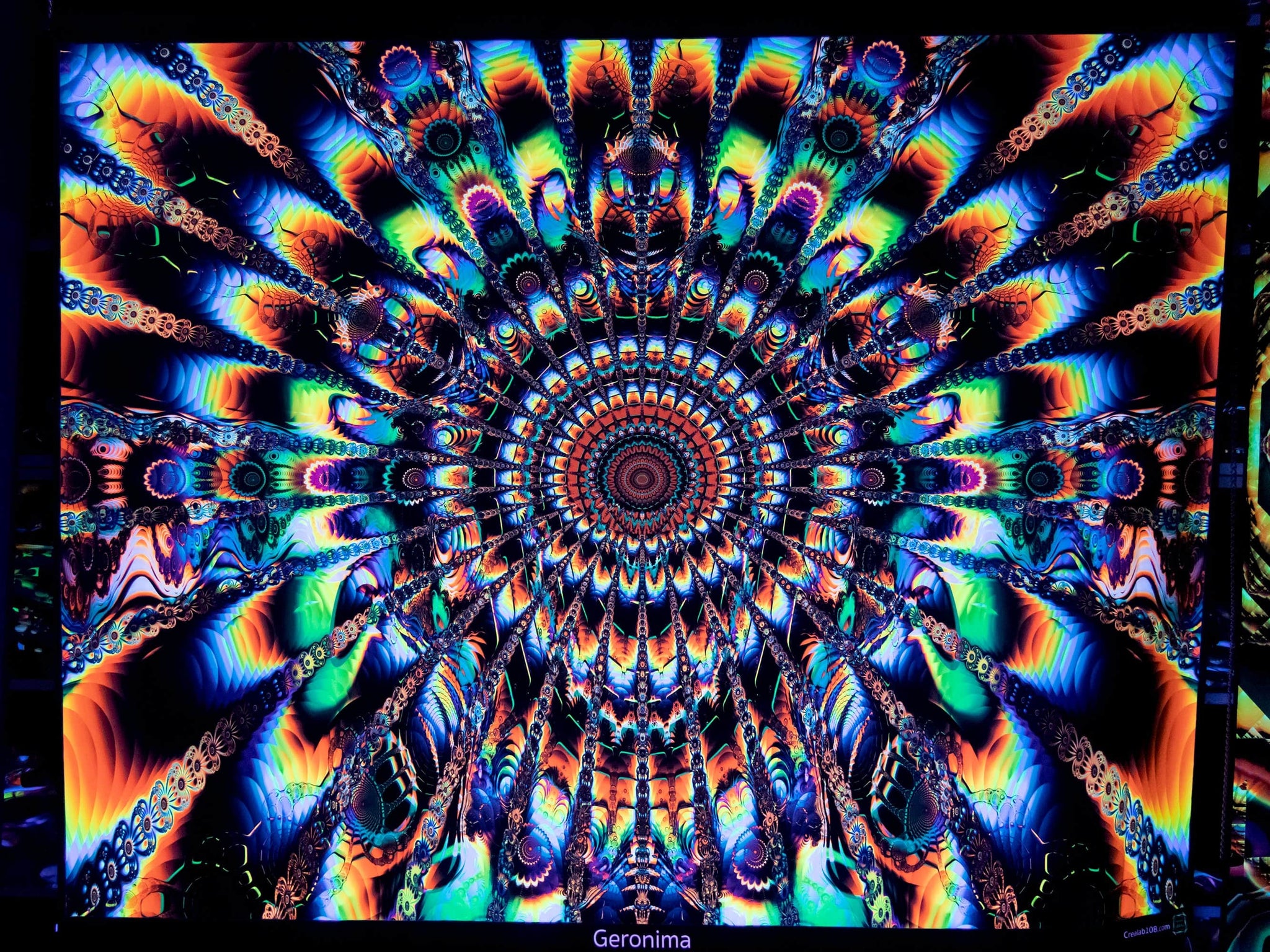 Printed tapestries with UV fluorescent ink to become color-animated under RGB Led light and fully glowing under UV light.