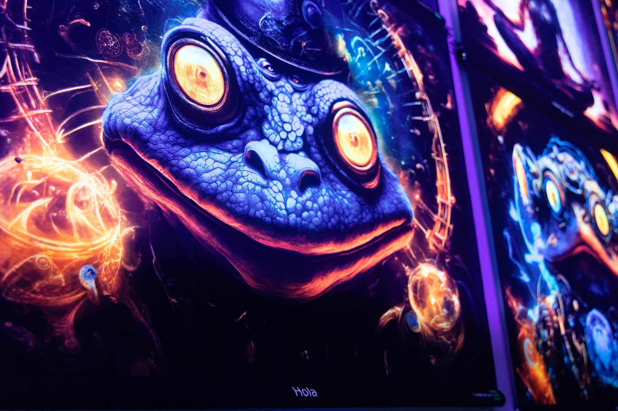 Printed tapestries with UV fluorescent ink to become color-animated under RGB Led light and fully glowing under UV light.