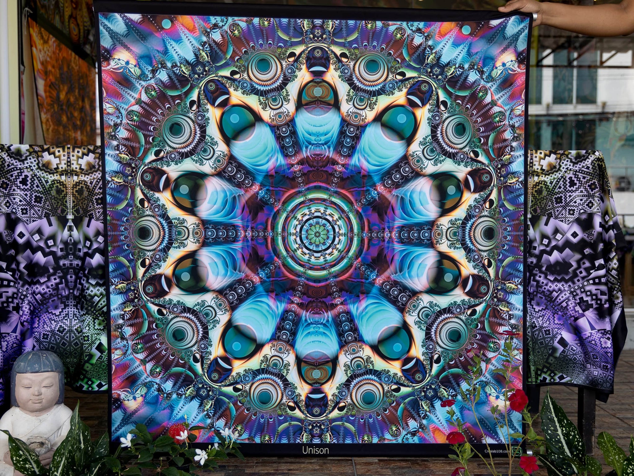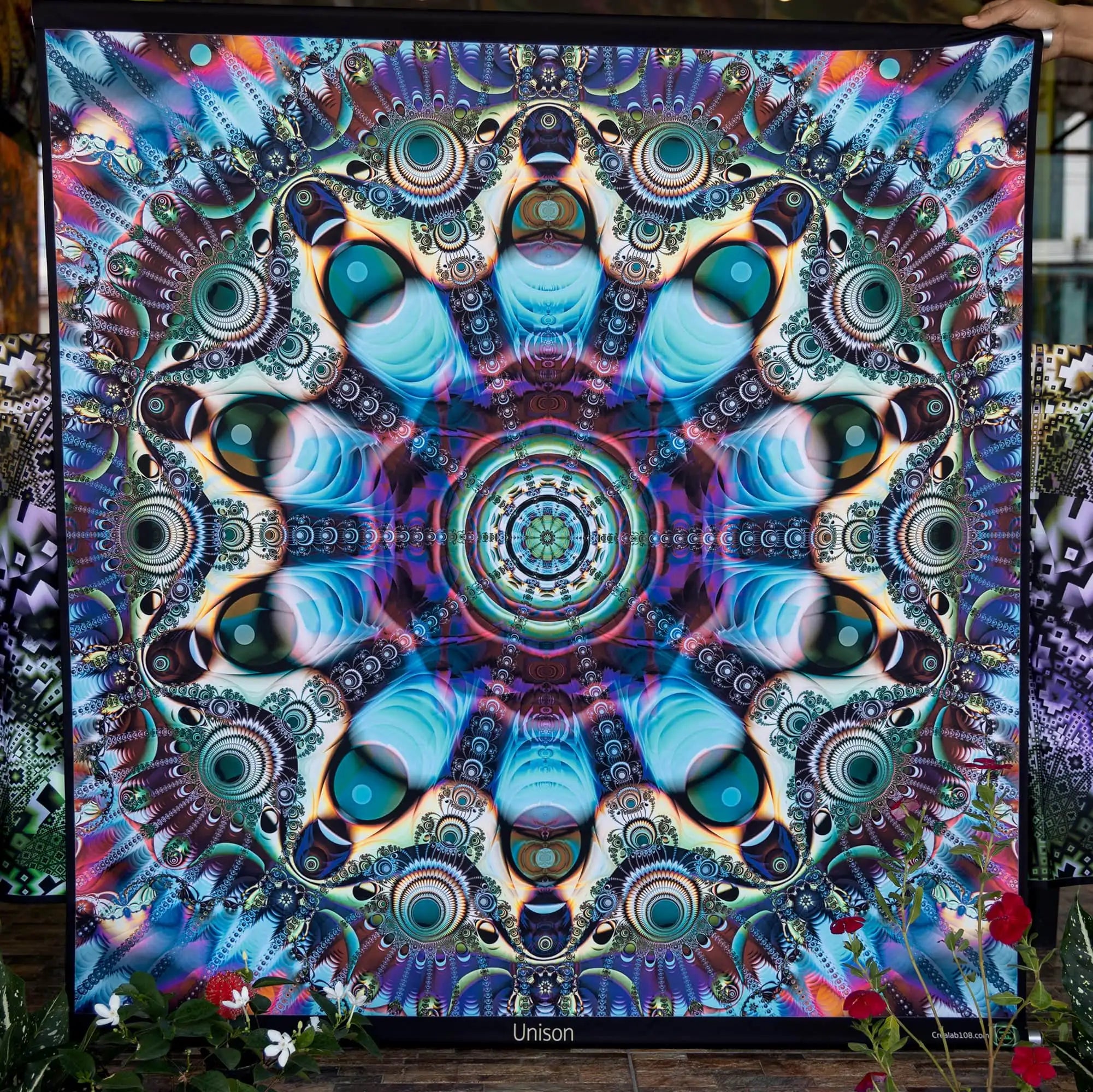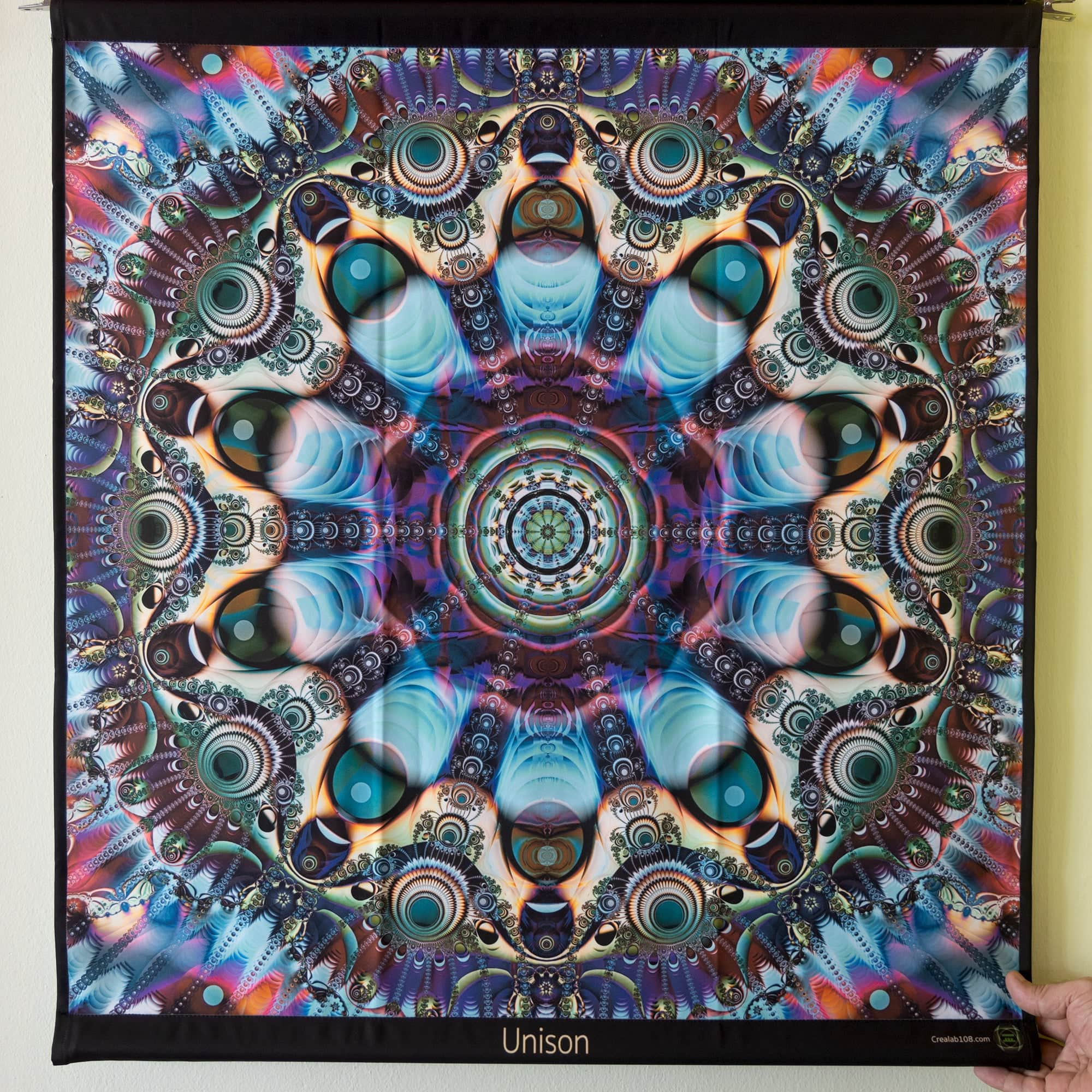 Printed tapestries with UV fluorescent ink to become color-animated under RGB Led light and fully glowing under UV light.