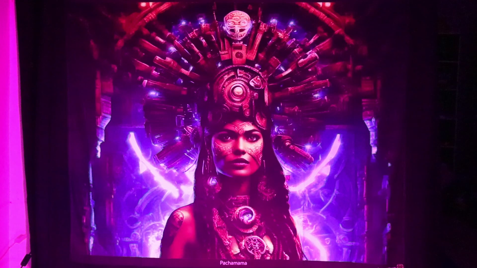 Printed tapestries with UV fluorescent ink to become color-animated under RGB Led light and fully glowing under UV light.
