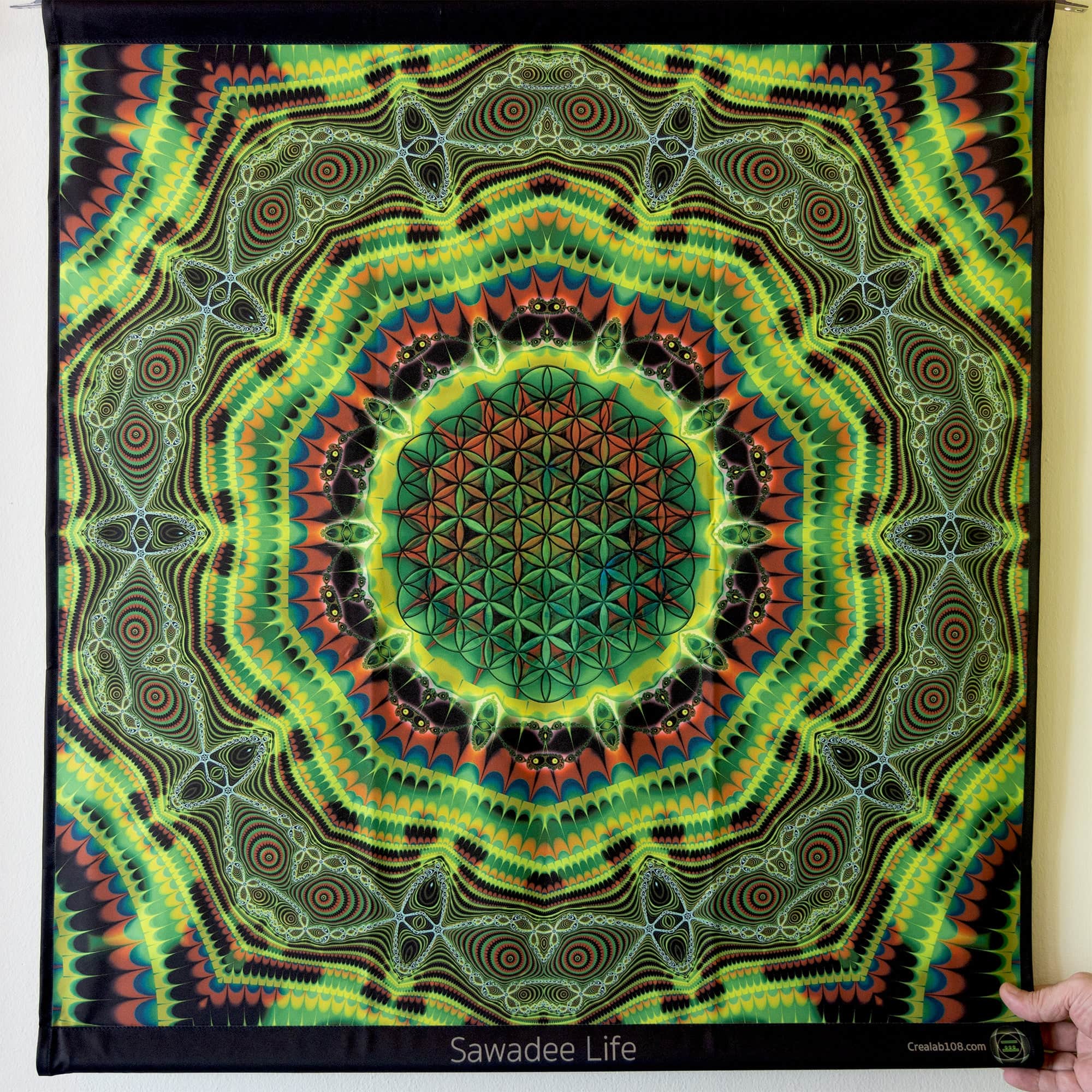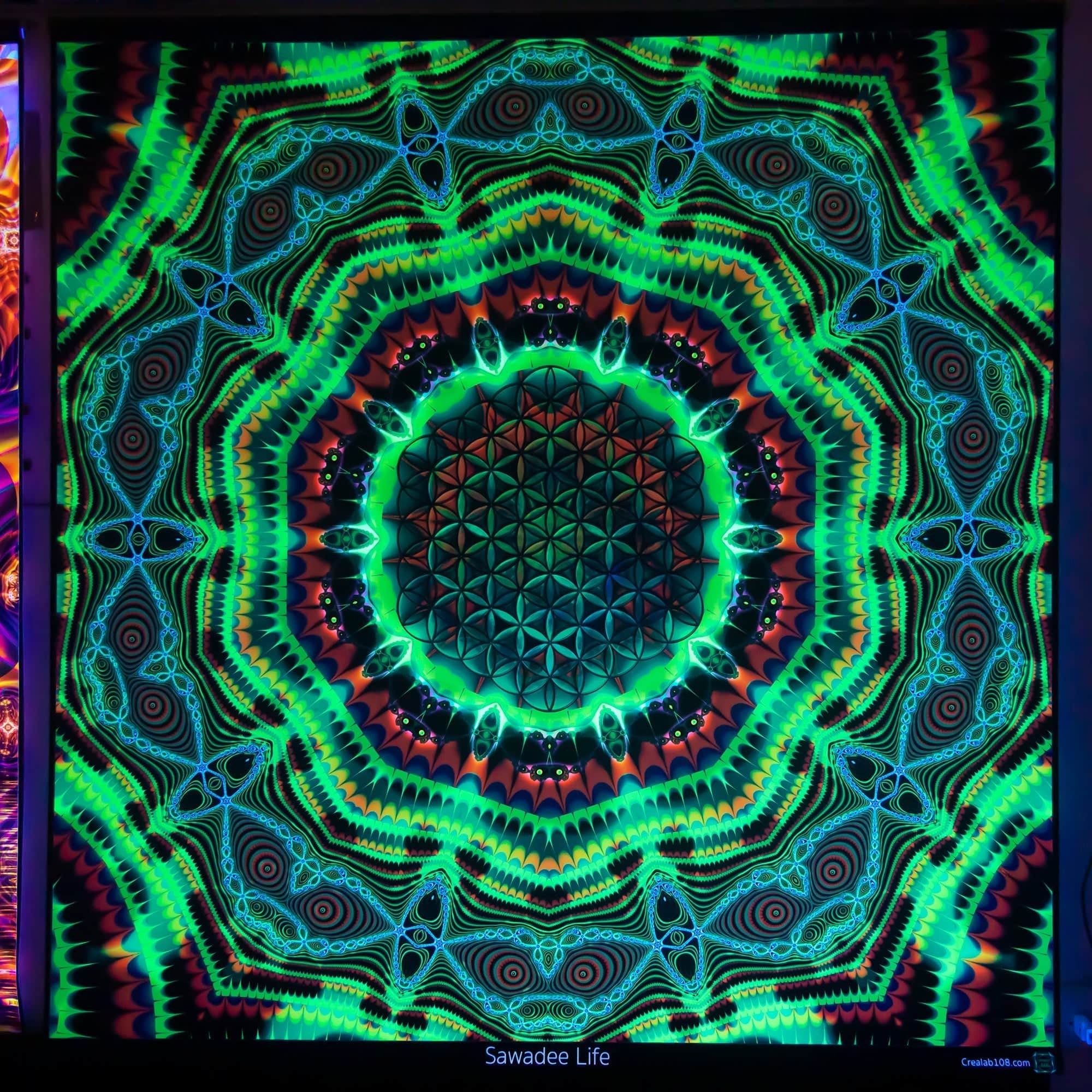 Tentures réagissantes aux UV qui deviennent aussi animées sous lumière LED RGB. Disponible en plusieurs tailles de petites à GÉANTE ainsi que sur mesure. La technique d'impression s´appel "sublimation". Ce procédé offre une grande durabilité et une excellente reproduction de l'œuvre originale. Ne vous inquiétez pas si salit lors d'une fête ou d'un festival, mettez-la simplement au lavage et elle ressortira propre sans perdre ses couleurs.